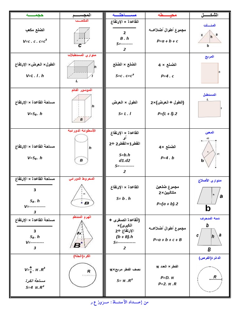 ملخص قوانين مساحات وحجوم الأشكال الخوارزمى لمحبى الرياضيات Facebook