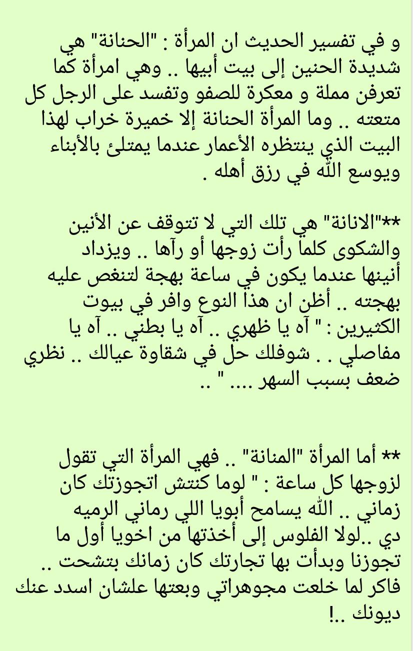 مصطفى عبد اللطيف On Twitter نصيحة وجهها احد الاعراب عن انواع المرأة التى لا يجب على ابنه ان يتزوج واحده منهن فقال له يا بني لاتنكح المنانه ولا الانانه ولا الحنانه ولا