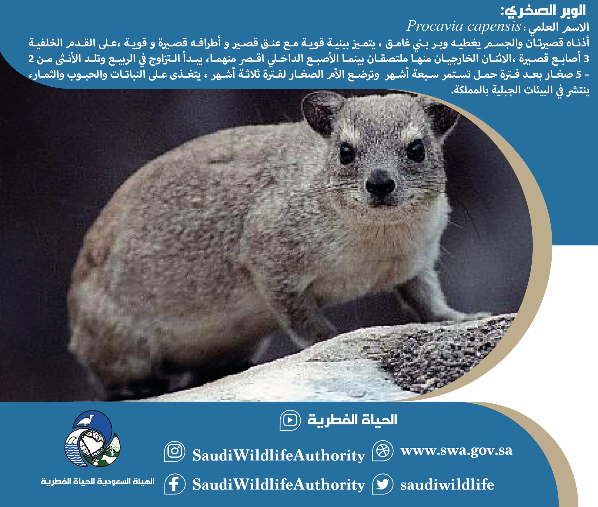 الهيئة السعودية للحياة الفطرية على تويتر الوبر الصخري أذناه قصيرتان والجسم يغطيه وبر بني غامق يتميز ببنية قوية مع عنق قصير و أطرافه قصيرة و قوية على القدم الخلفية 3 أصابع قصيرة الاثنان الخارجيان